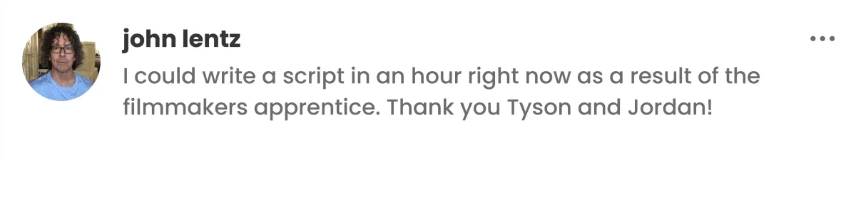 "I could write a script in less than an hour right now as a result of the Filmmaker's Apprentice! Thank you Tyson and Jordan for helping the many filmmakers out there like me!"